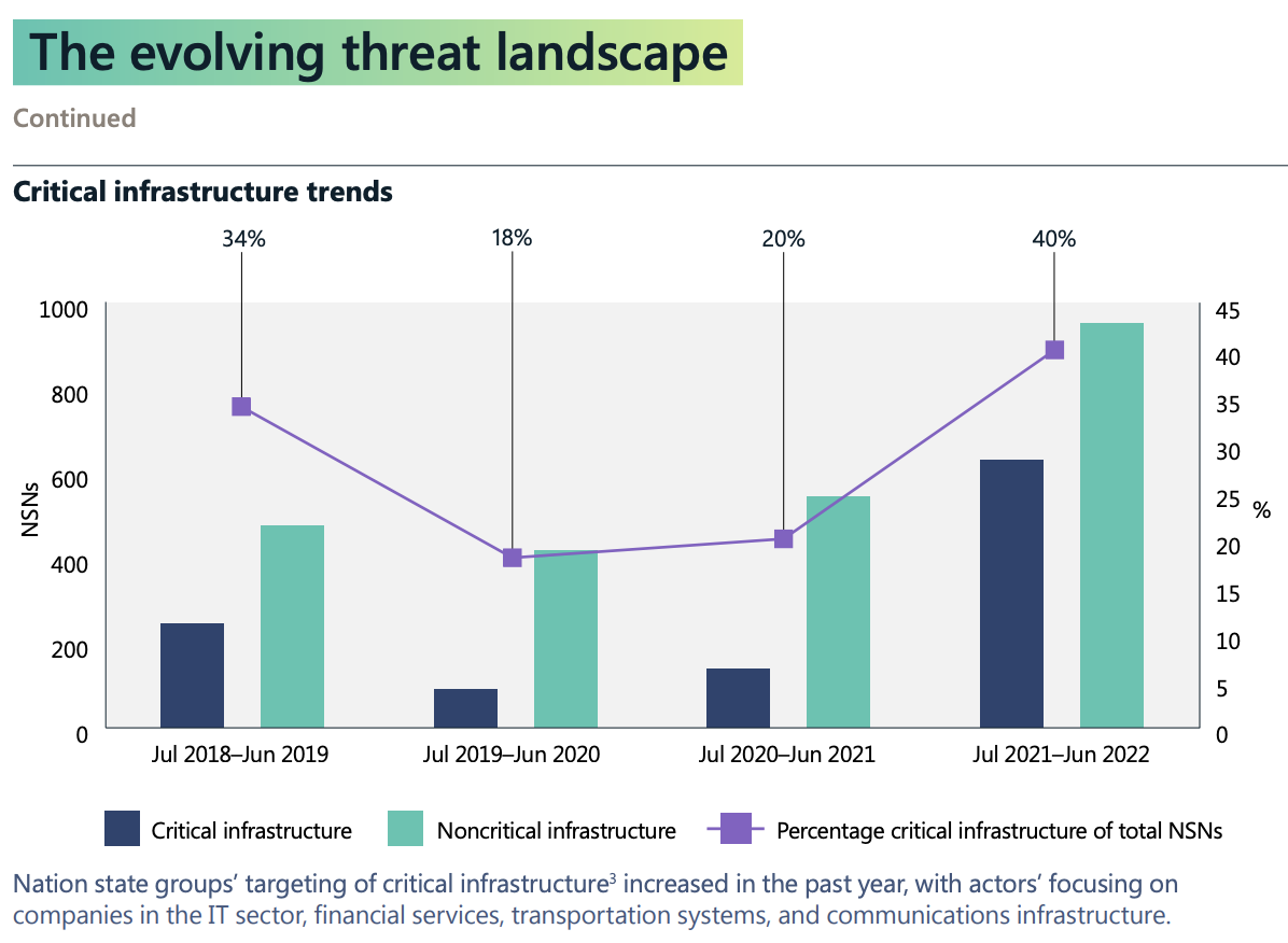 As Microsoft's Digital Defense Report noted, there has been a significant increase in cyberattacks aimed at critical infrastructure, with nation-state attacks on critical infrastructure rising from 20% to 40% from 2020-2022.