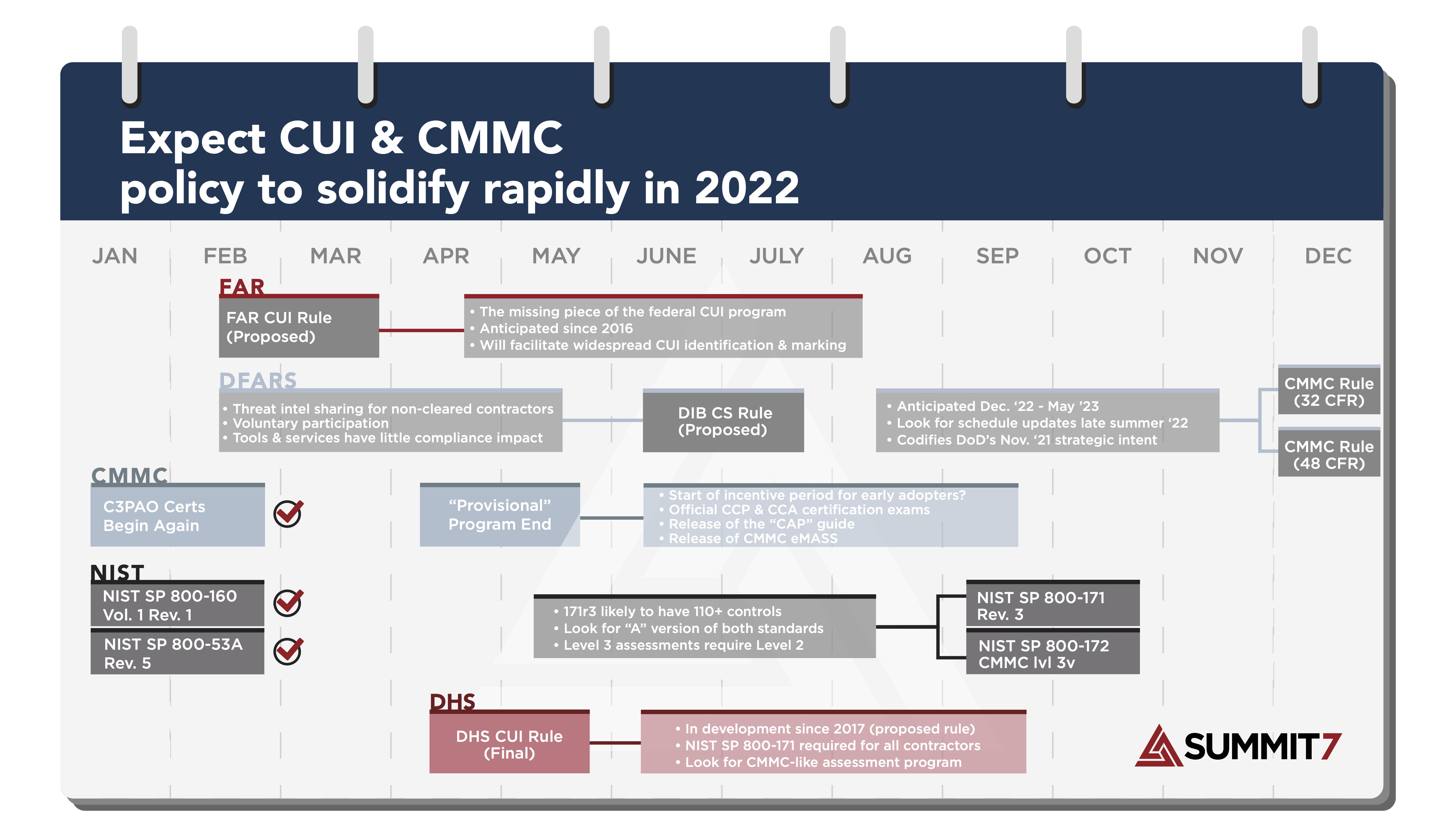 The CMMC rules are currently on the DoD’s rulemaking docket for publication in December of 2022. We anticipate a publication window between December 2022 and May 2023, which fits squarely in DoD’s public estimate of 9 – 24 months.